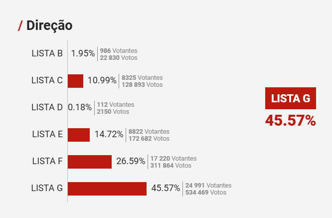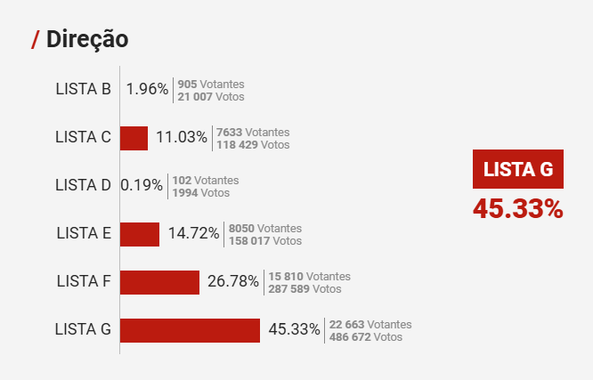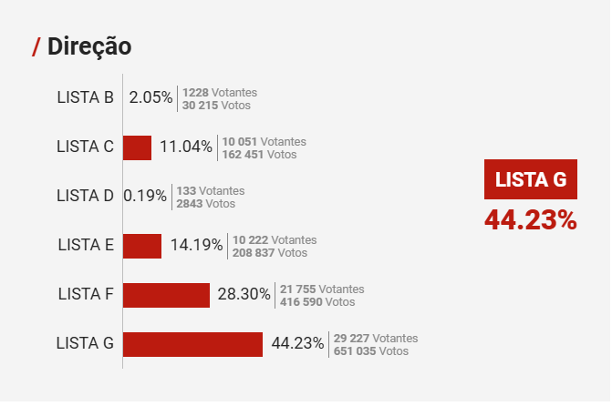 Lista G de Rui Costa lidera com 44,42%, Lista F de Noronha Lopes recolhe 27,43%