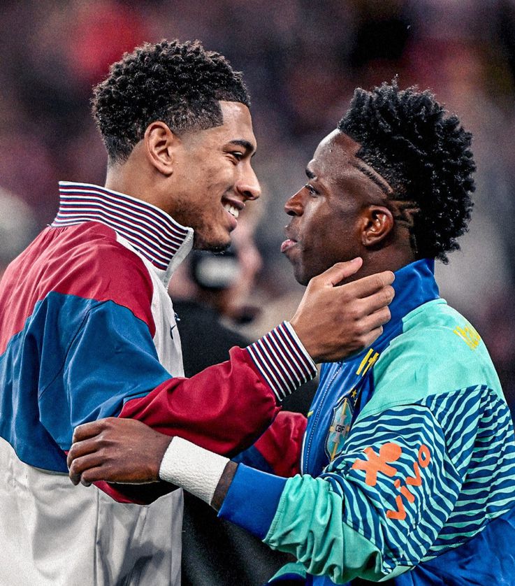 O ataque do Real Madrid está em campo neste duelo de Wembley: Bellingham do lado inglês; Rodrygo e Vinicius Jr. do lado brasileiro e em grande destaque nas movimentações ofensivas da canarinha.