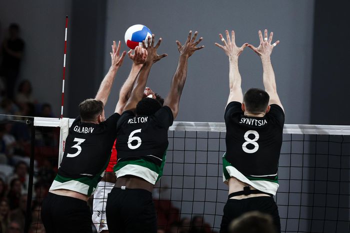 Remate e a bola bate no bloco do Benfica e vai para fora. Sporting vence primeiro set por 19-25