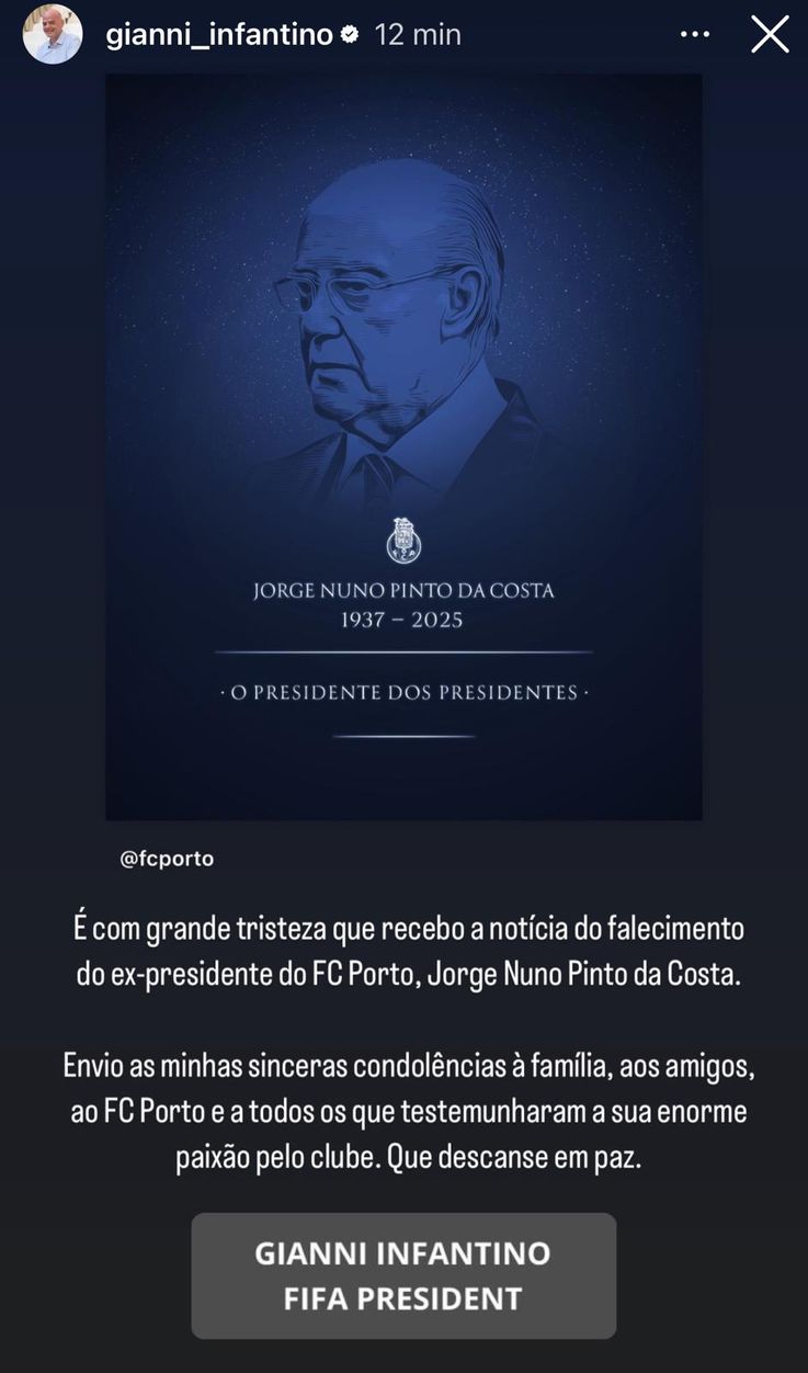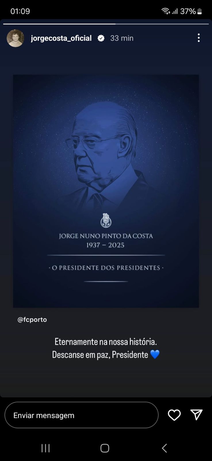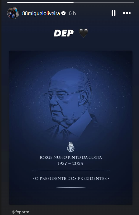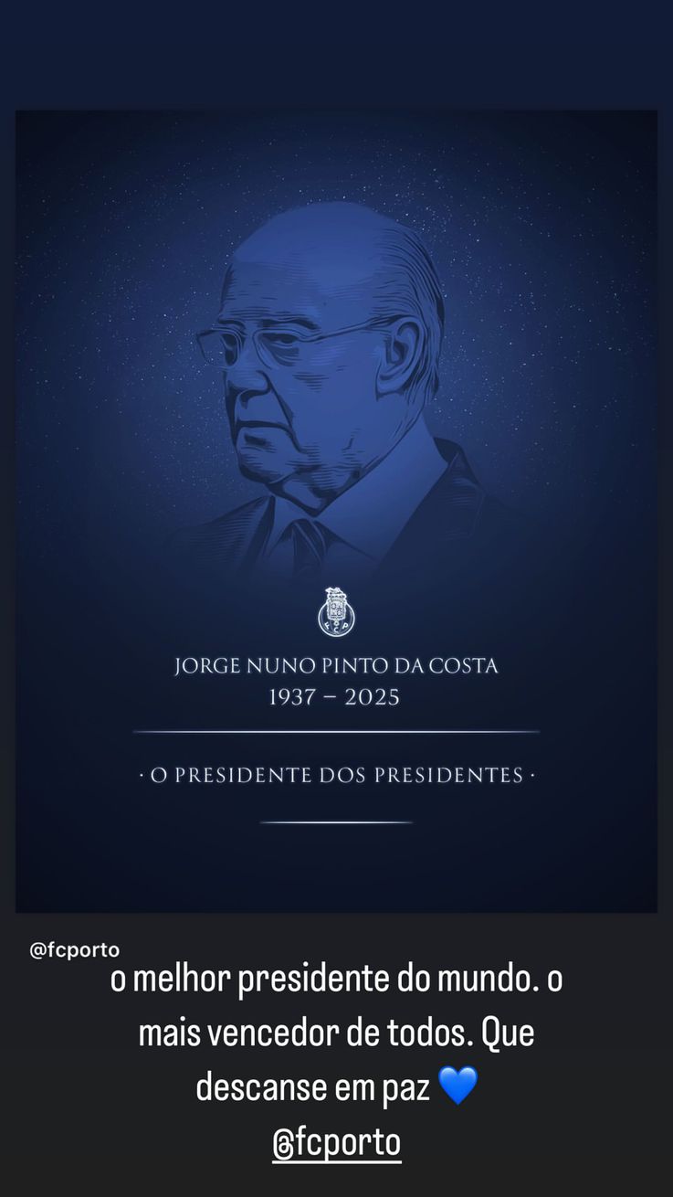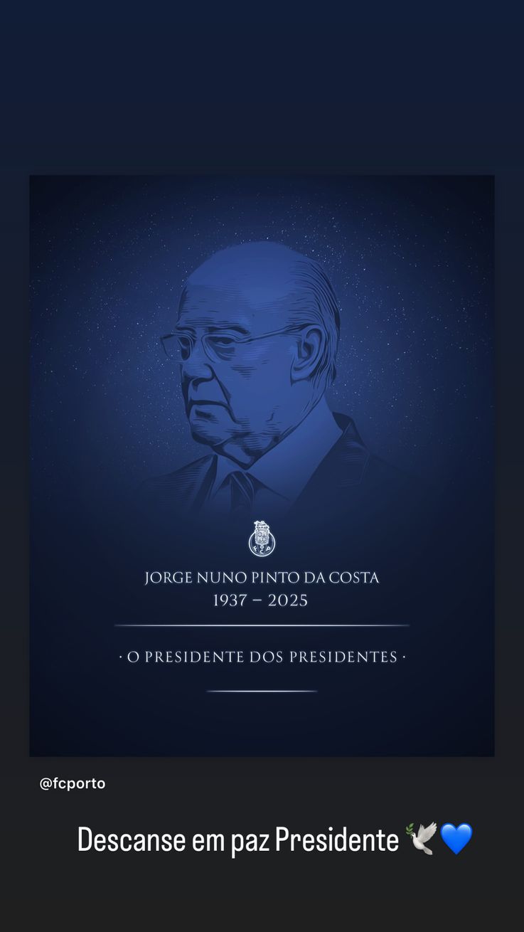 REAÇÃO DE DIOGO COSTA, CAPITÃO DO FC PORTO: «O FC Porto perdeu hoje a sua maior referência, e todos nós, portistas, perdemos um símbolo de dedicação, ambição e paixão pelo clube. Desde pequeno, sempre soube que vestir esta camisola significava muito mais do que jogar futebol. Significava representar uma história construída por um homem que fez do FC Porto um gigante. Ter tido o privilégio de partilhar momentos consigo foi uma honra que guardarei para sempre. O seu legado viverá em cada jogo, em cada conquista e em cada portista que continuar a lutar por este clube. Os meus sentimentos à família e a todos os que sentem esta perda. Descanse em paz, Sr. Presidente».