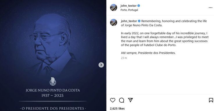 O empresário americano John Textor também não deixou de comentar a morte do antigo presidente do FC Porto, revelando que ficou marcado por um encontro entre os dois em 2022, ano em que empresário quis ser acionista do Benfica. «Recordar, homenagear e celebrar a vida de Jorge Nuno Pinto da Costa. No início de 2022, num dia esquecível do seu incrível percurso, vivi um dia que irei sempre recordar... Tive o privilégio de conhecer o homem e de aprender com ele sobre os grandes sucessos desportivos das gentes do Futebol Clube do Porto», escreveu, fechando em português: «Até sempre, Presidente dos Presidentes»