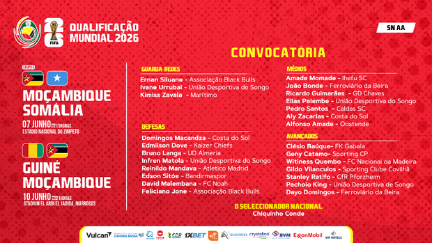 O ala do Sporting esteve na Academia de Alcochete a recuperar de uma lesão contraída no final da Taça de Portugal para ser opção de Chiquinho Conde para o encontro com a Somália, no próximo dia 7, no Estádio Nacional do Zimpeto, em Maputo, de seguida a equipa viajará para Marrocos, com escala em Portugal, para o jogo da 4.ª jornada do Grupo G, frente à Guiné Conacri, a 10 de junho, no Stadium El Abdi El Jadida. Refira-se que os Mambas ocupam a 5.ª posição do agrupamento, com três pontos (vitória frente ao Botswana, por 3-2, na 1.ª jornada).