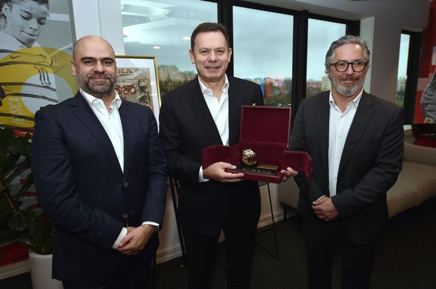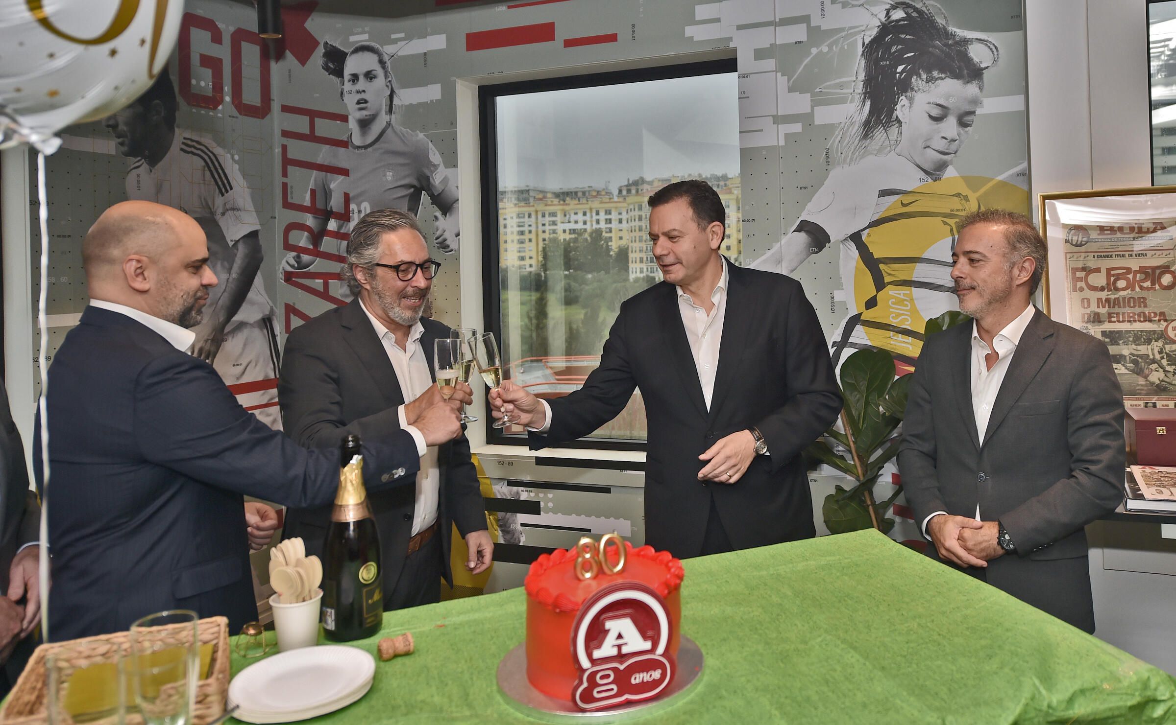 «Vocês fazem anos e eu é que recebo presentes?», solta entre a boa disposição que marcou toda a visita. Luís Montenegro tinha na zona de convívio do 7.ª andar das Torres de Lisboa, à espera e em destaque, uma moldura com a capa que celebrou a conquista da primeira Taça dos Campeões Europeus pelo seu FC Porto, em 1987. Recebeu depois dois livros publicados por A BOLA (um sobre a vida de Eusébio, da autoria do jornalista António Simões, outro sobre o Mundial de 1966, um álbum fotográfico). Para o final, um momento inédito: pela primeira vez, alguém que não marcou golos no campeonato nacional recebeu A Bola de Prata, troféu extra-oficial mais antigo do futebol português. «Fica bem, para se lembrarem que fui ponta-de-lança», exclamou Montenegro, praticante assíduo de futebol até há bem poucos anos.