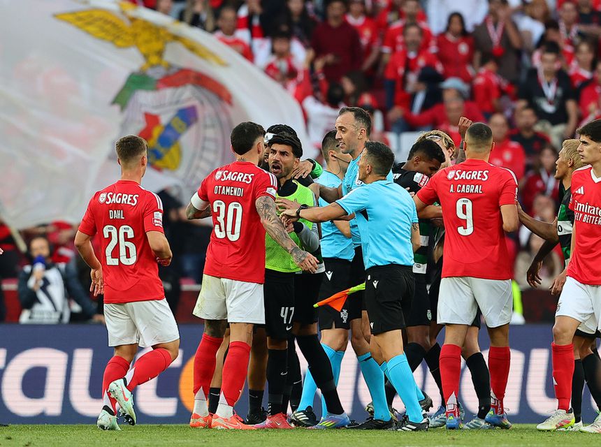39' A bola ainda entra na baliza encarnada, no remate de Pedro Gonçalves, embora com o jogo já interrompido, e esteve bem o árbitro porque Gyokeres após rematar e ao levantar-se acaba por carregar António Silva nas costas além de lhe tocar com a sua perna esquerda na perna esquerda do central benfiquista, falta atacante bem assinalada.