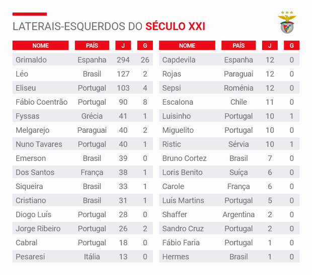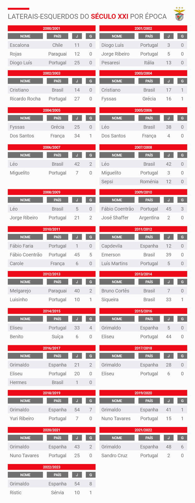 Mas Siqueira ficou apenas um ano no Benfica e para o seu lugar viram dois homens que, com qualidades bem diferentes, marcariam as temporadas 2014/2015, 2015/2016 e 2016/2017: Eliseu (97 jogos e 4 golos) e Grimaldo (26 jogos e 2 golos). E em 2018/2019, com a reforma de Eliseu, Grimaldo tomou conta do lugar e não deixou margem para mais ninguém nas cinco épocas seguintes: 240 jogos e 24 golos. Nuno Tavares (40 jogos), Ristic (10), Yuri Ribeiro (7) e Sandro Cruz (2) quase nem sombra fizeram ao espanhol.