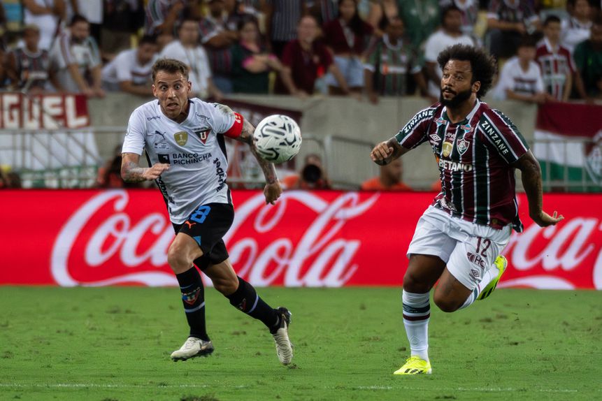 Momentazo cortesía del gran Marcelo. Hay penal para Fluminense en la Recopa. El crack toma el balón para cobrar. Los jugadores de Liga de Quito se le acercan para desconcentrarlo.