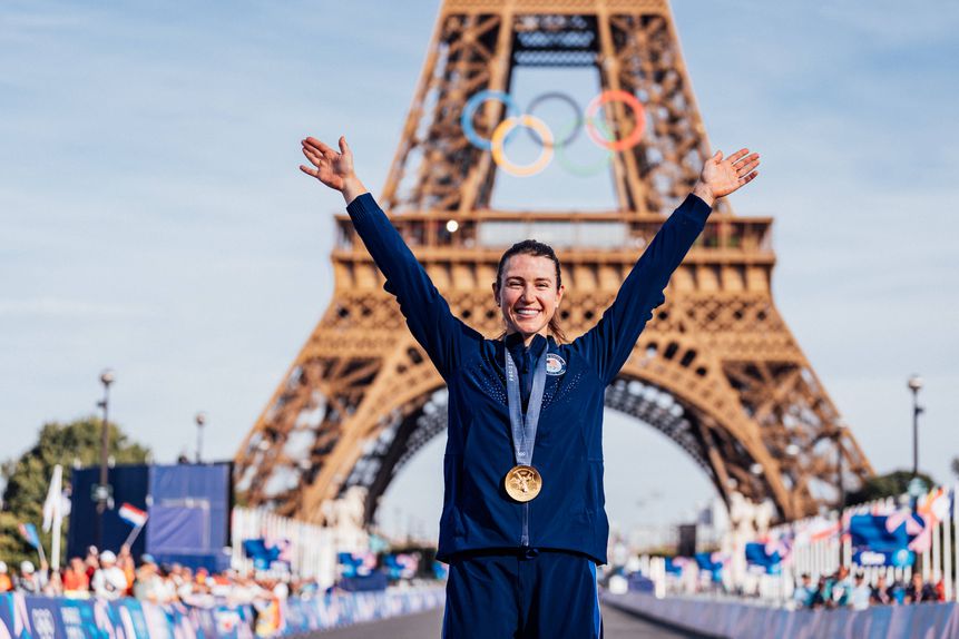A prova de estrada e ciclismo feminino dos Jogos Olímpicos acabou no Trocadéro há cerca de uma hora, e ela continua a não acreditar naquilo que os seus olhos veem.
