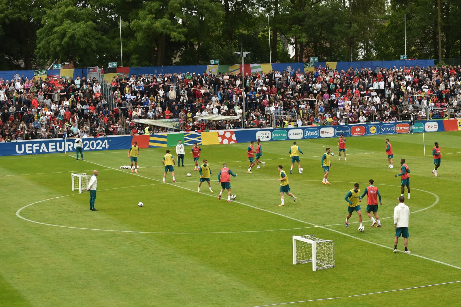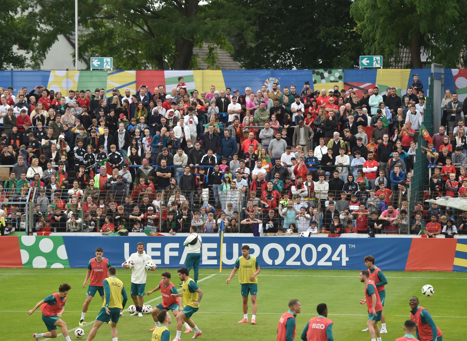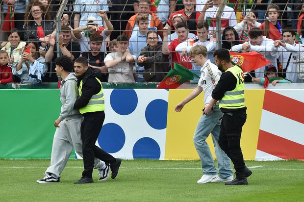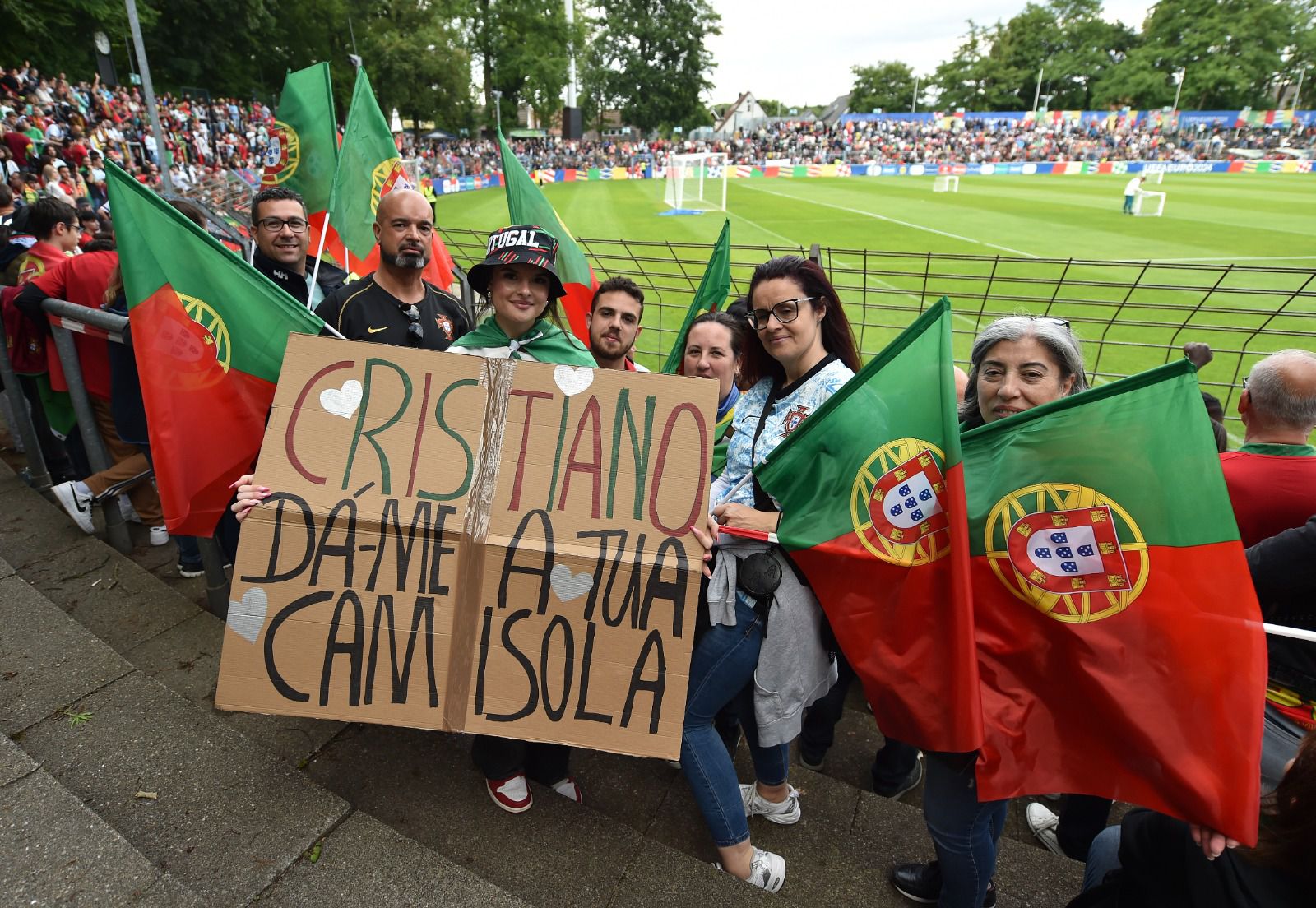 Depressa, porém, esqueciam exercícios de futurologia. Gutersloh, uma localidade que fica situada a cerca de 10 quilómetros de Marienfield, casa forte da seleção, foi completamente invadida por uma onda lusitana. Literalmente. Naquela hora e meia de treino — pouco exigente, menos tático, e que serviu, sobretudo, para animar os 8.210 presentes — houve mais de uma dezena de tentativas de invasões de campo, uma placagem feita pelo guarda-redes José Sá, já na parte final, para impedir um adepto que vinha mais acelerado, um sem número de manifestações de carinho em todos os exercícios, todo o sorriso de um internacional português, de cânticos (muitos...) direcionados, claro está, a Cristiano Ronaldo.