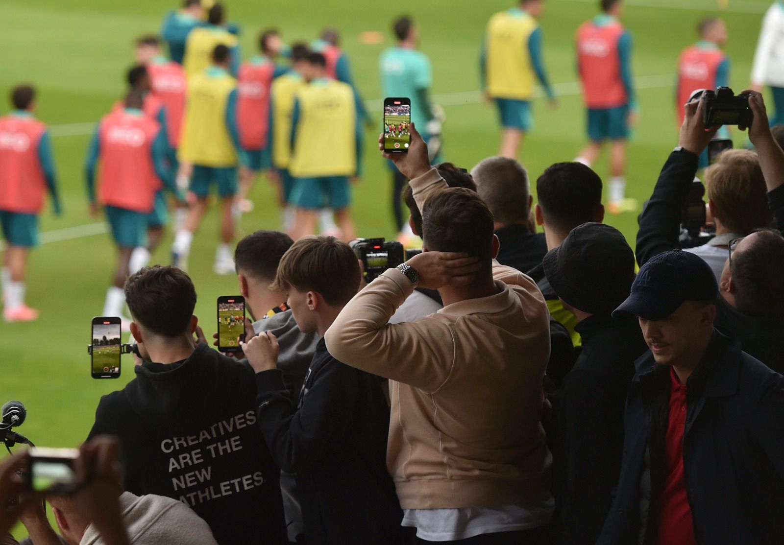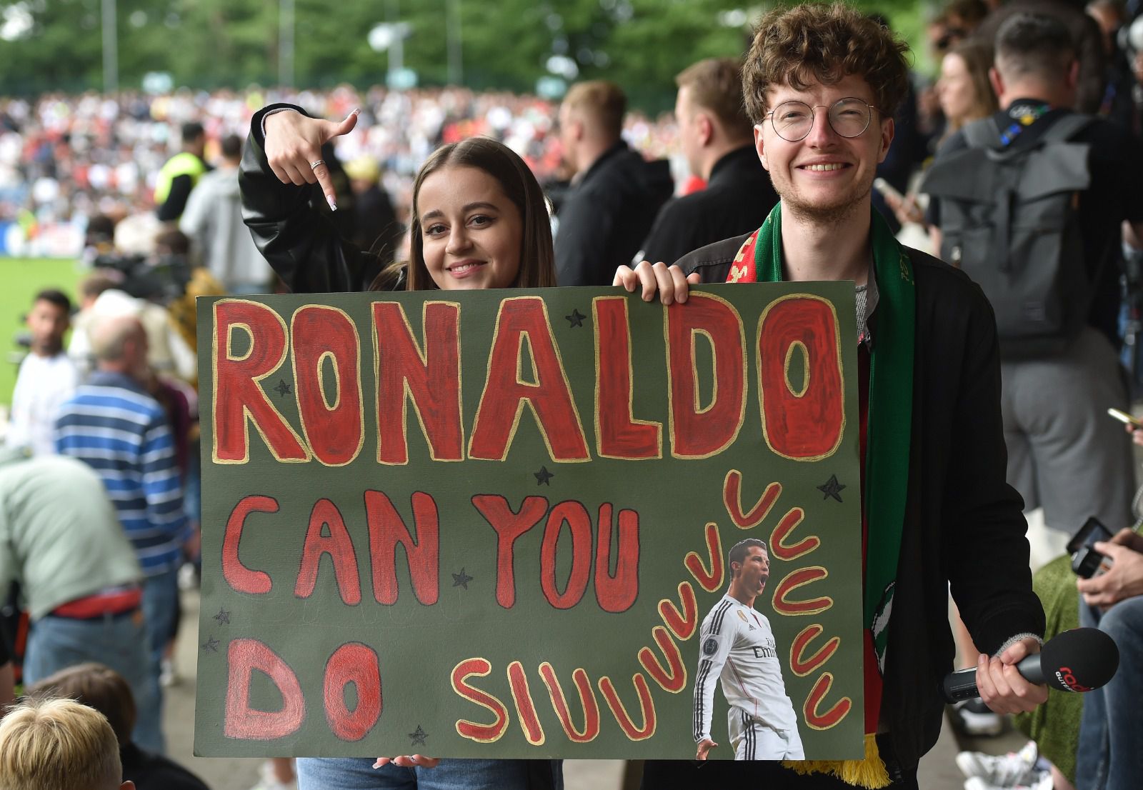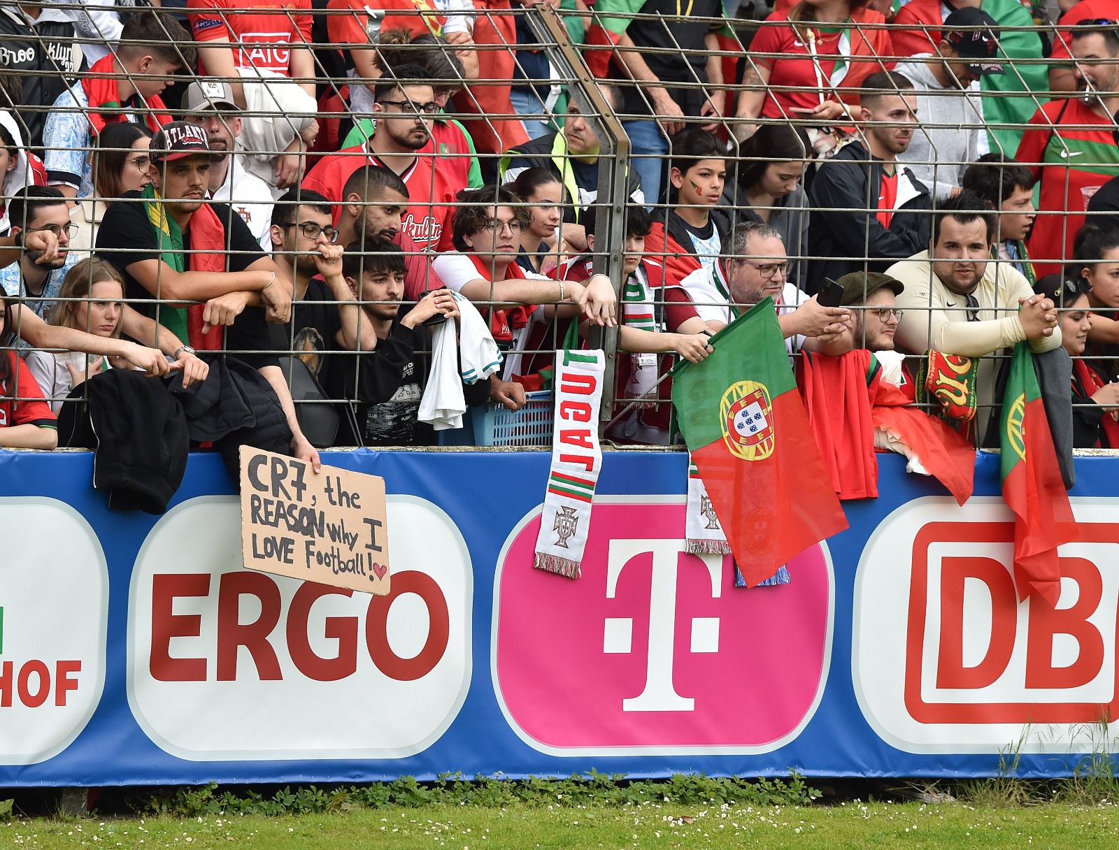 Depressa, porém, esqueciam exercícios de futurologia. Gutersloh, uma localidade que fica situada a cerca de 10 quilómetros de Marienfield, casa forte da seleção, foi completamente invadida por uma onda lusitana. Literalmente. Naquela hora e meia de treino — pouco exigente, menos tático, e que serviu, sobretudo, para animar os 8.210 presentes — houve mais de uma dezena de tentativas de invasões de campo, uma placagem feita pelo guarda-redes José Sá, já na parte final, para impedir um adepto que vinha mais acelerado, um sem número de manifestações de carinho em todos os exercícios, todo o sorriso de um internacional português, de cânticos (muitos...) direcionados, claro está, a Cristiano Ronaldo.