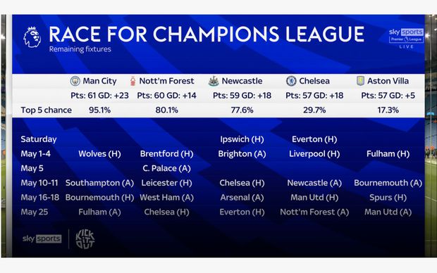 Olhando para o calendário, ou seja, para as últimas cinco jornadas, os blues têm, teoricamente, a tarefa mais complicada e a Sky Sports afirma mesmo que as suas probabilidades de terminar nos primeiros cinco lugares são de... 29,7%. Já o Aston Villa, sétimo, tem 17,3%, enquanto Newcastle (77,6%), Nottingham Forest (80,1%) e Manchester City (95,1%) têm mais motivos para sorrir. Arsenal nem entra nestas contas por precisar de apenas duas vitórias em cinco jogos.
