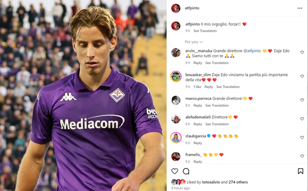 «O meu orgulho, força», escreveu na sua conta da rede social Instagram o dirigente português, que trabalhou com o jogador de 22 anos na Roma, clube que esta temporada cedeu o italiano ao emblema de Florença.