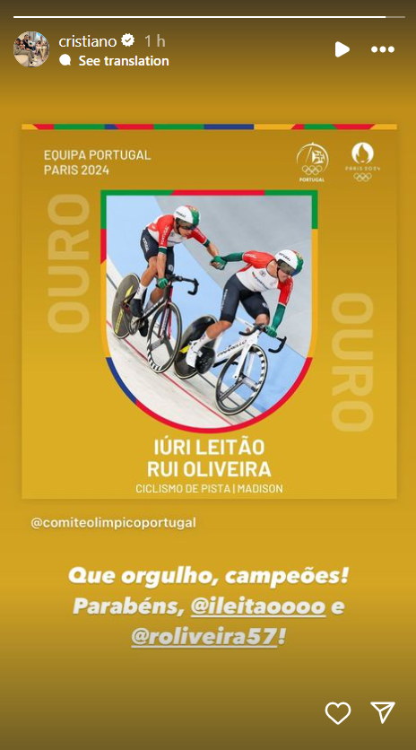 Cristiano Ronaldo não se mostrou indiferente à medalha de ouro conquistada por Iúri Leitão e Rui Oliveira em madison e elogiou os dois compatriotas com mensagem de apoio nas redes sociais.