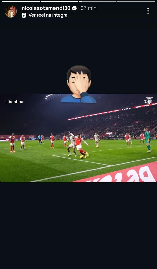 Nicólas Otamendi seguiu a tendência de críticas do Benfica ao golo anulado a Samuel Dahl aos 74', na visita a Braga (2-2). O defesa central argentino republicou o ângulo do lance destacado pelas águias nas redes sociais com um emoji que refletiu a incredulidade face à decisão do árbitro João Gonçalves.