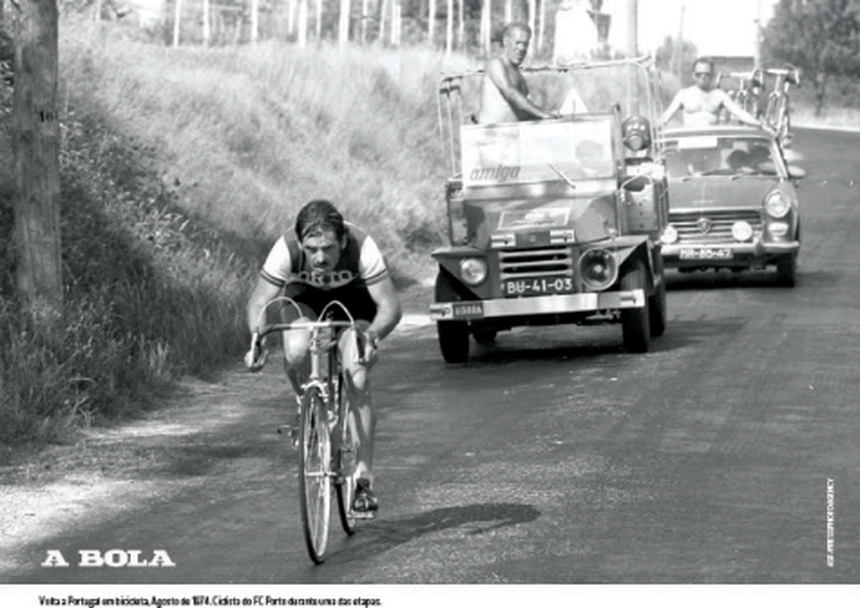 Na FOTOGRAFIA COM HISTÓRIA desta quinta-feira, A BOLA mostra um momento de concentração de um ciclista do FC Porto, galopando a todo o gás na dianteira de dois (antigos) carros de apoio.
