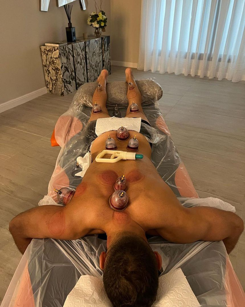 Karim Benzema surpreendeu nas redes sociais, ao partilhar uma fotografia das suas costas após realizar um tratamento com ventosas chinesas.