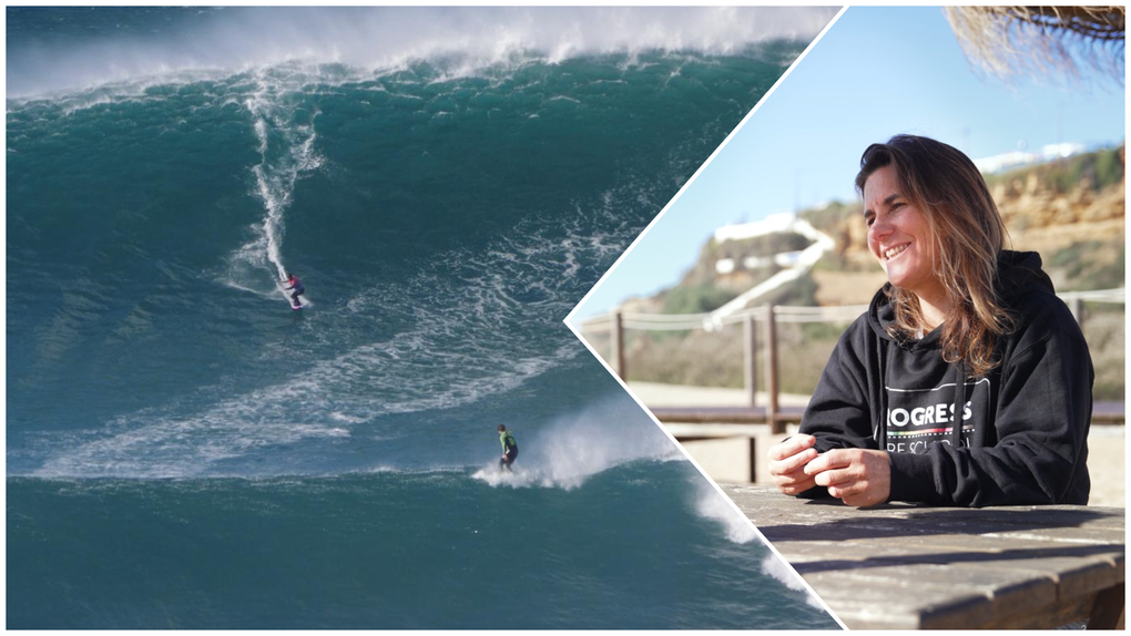 Joana Andrade, 43 anos, 1,50 m contra os 15 (ou 20 m) das gigantes da Nazaré (Foto Sunny Breger)