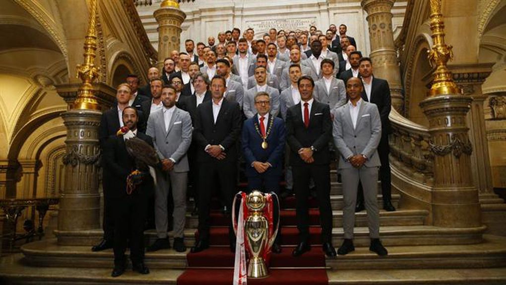 O presidente da Câmara Municipal de Lisboa, Carlos Moedas, recebeu na tarde desta segunda-feira os jogadores e comitiva do Benfica, que se sagraram sábado campeões nacionais de futebol 2022/23, pela 38.ª vez na história do clube, em tributo ao feito e, em nome da edilidade, agradeceu aos encarnados a proeza, celebrada na praça dos Paços do Concelho por milhares de adeptos do clube, que festejaram enquanto esperavam os seus ídolos na varanda da autarquia, para a apoteose, com os jogadores a mostrarem o troféu relativo à conquista da Liga.