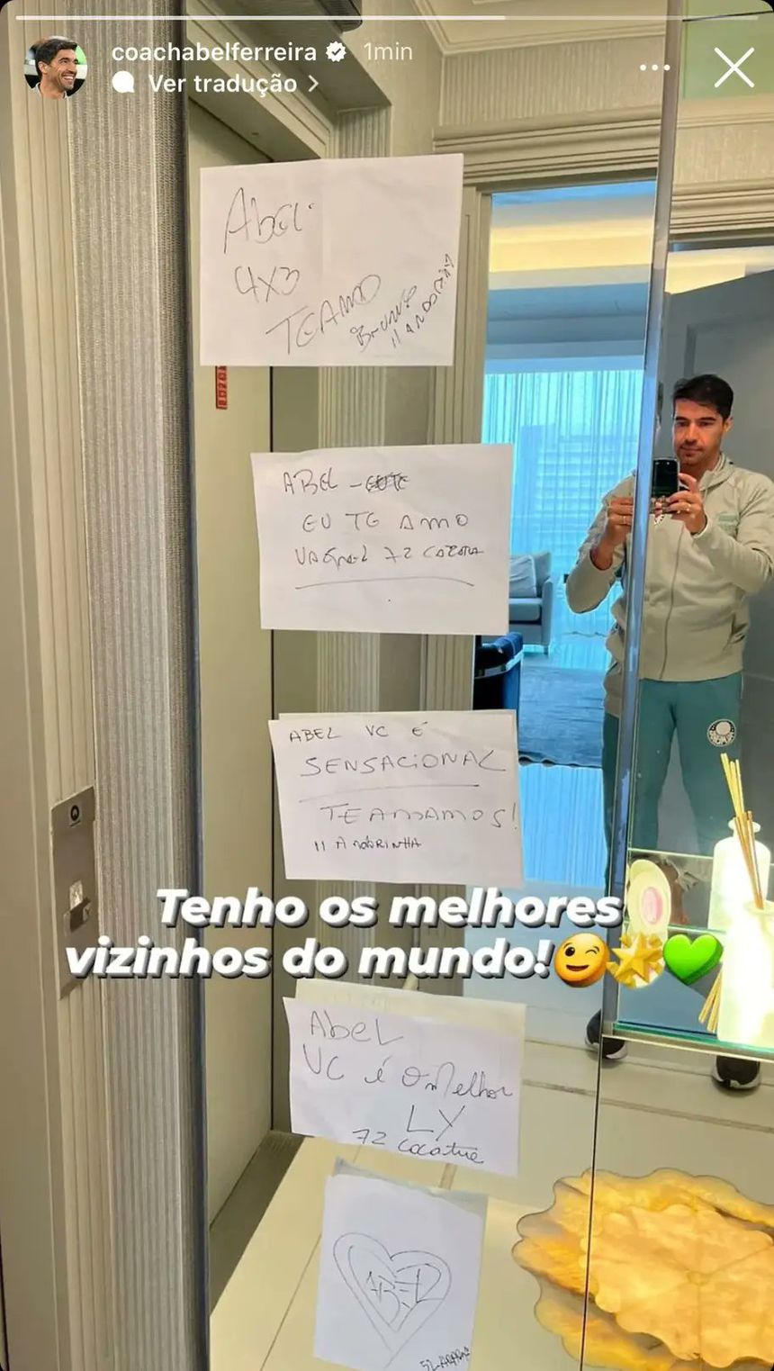 Abel Ferreira ainda nem estava refeito das emoções fortes da vitória (4-3) sobre o Botafogo quando, no regresso a casa, após a partida que muita polémica acabou por suscitar, deu de caras com várias mensagens de apoio... dos vizinhos.