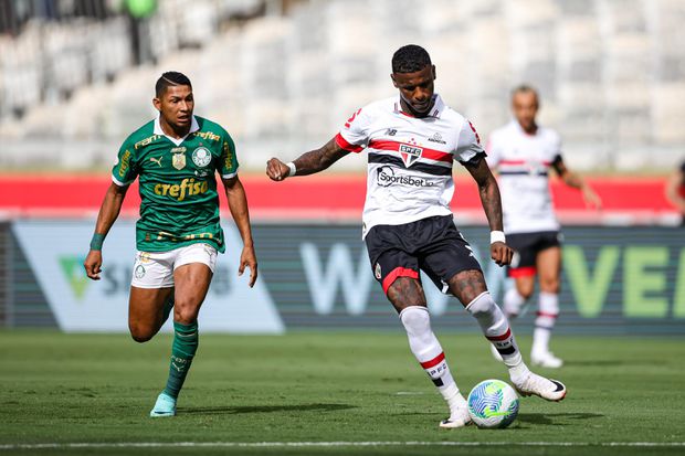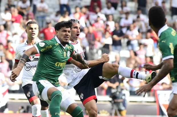 90+3' Gabriel Menino tenta o chapéu dentro da área do São Paulo, mas a bola é desviada. Canto para o Palmeiras!