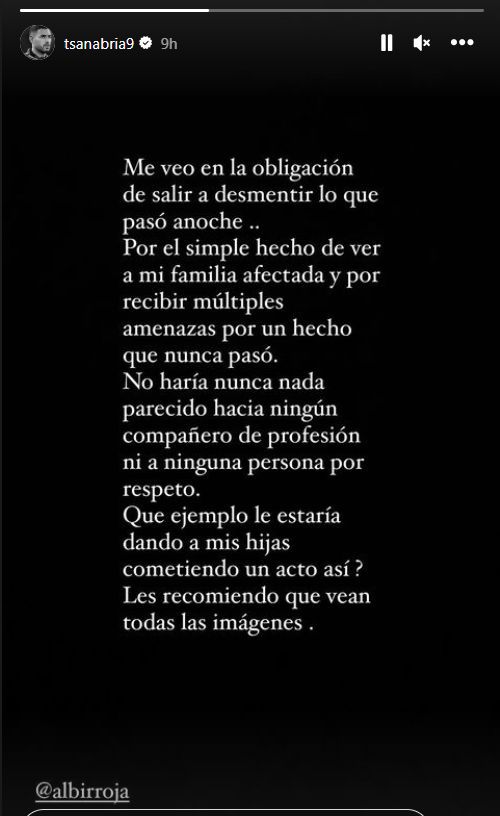 «Sinto-me na obrigação de vir negar o que aconteceu ontem à noite... Pelo simples fato de ver a minha família afetada e de receber múltiplas ameaças por algo que nunca aconteceu. Nunca faria algo assim com um colega ou qualquer pessoa por respeito. Que exemplo estaria a dar às minhas filhas ao cometer um ato como esse? Recomendo que vejam todas as imagens», pediu.