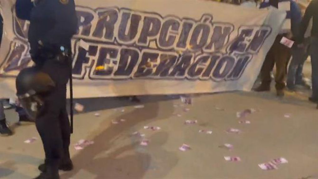 Demonstration at the Santiago Bernabéu to protest the Negreira case. They are throwing banknotes with Joan Laporta's face on them, shouting "corruption in the federation".@TheAthleticFC pic.twitter.com/jBRKwL2lhH