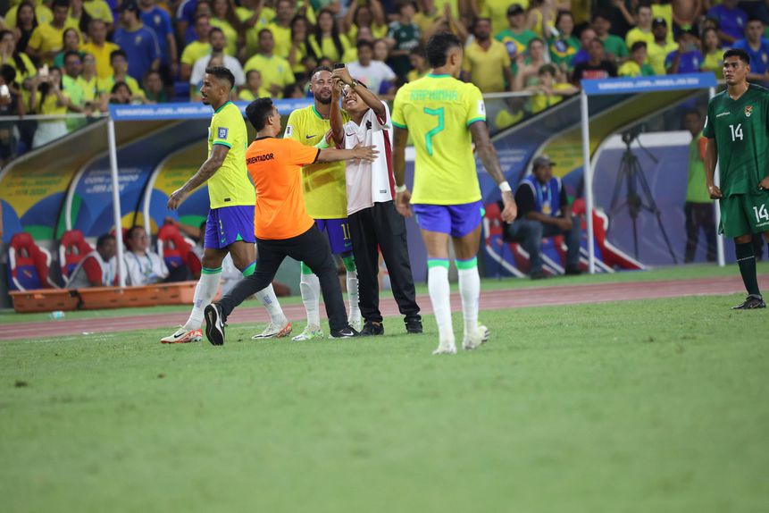 Eram já os momentos finais do Brasil-Bolívia, esta madrugada, quando dois adeptos conseguiram furar a segurança do estádio olímpico do Pará, conhecido como Mangueirão, e correr pelo relvado.