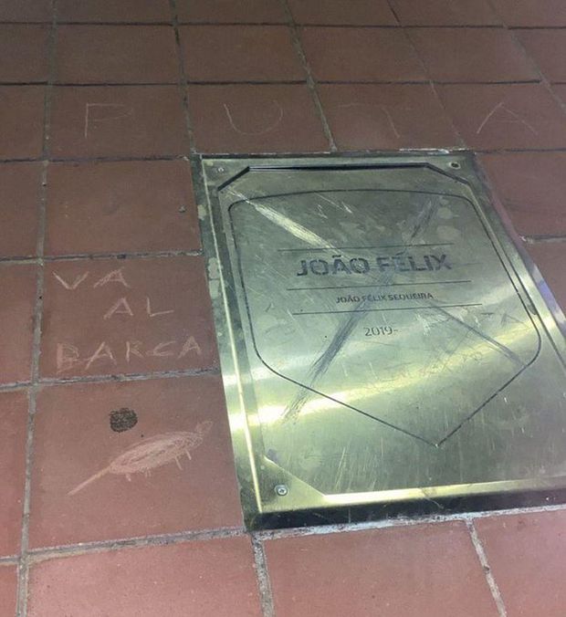 «P... Vai para o Barça» foi a mensagem que os adeptos colchoneros deixaram em cima e ao lado da placa, onde o nome de João Félix aparece, agora, riscado.