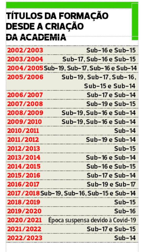 O resto? É história e os números falam por si. Desde 2020 a Academia passou a chamar-se Academia Cristiano Ronaldo, de modo a homenagear «o melhor jogador português de todos os tempos», como se lia na nota oficial do clube, e, assim, imortalizar o nome do maior símbolo de sempre que o Sporting formou e que será inspiração a seguir para os mais jovens.