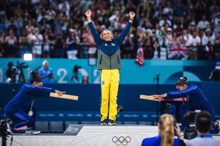 No momento mais ansiado, de lágrimas nos olhos para subir ao lugar mais alto do pódio, Rebeca Andrade recebe um gesto inesperado. Biles e Chiles, num momento claramente preparado, fazem-lhe uma vénia quando ela está a juntar-se no pódio. As lágrimas transformam-se num sorriso gigante nas três atletas.