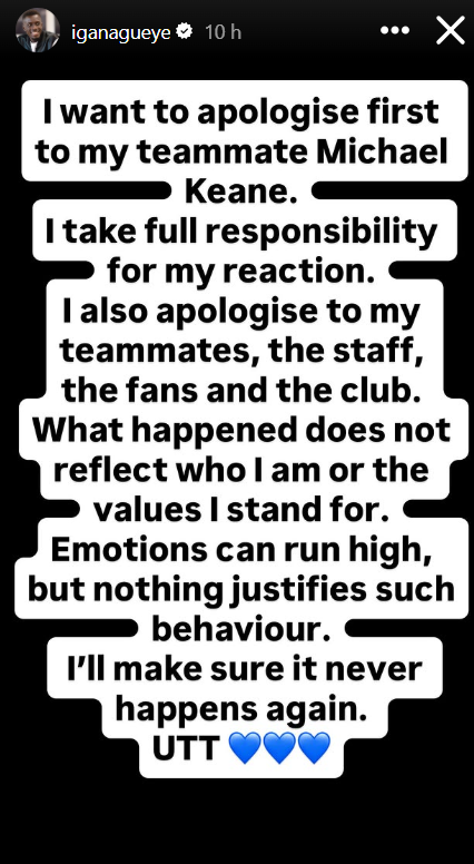 «Quero pedir desculpas em primeiro lugar ao meu colega de equipa Michael Keane. Assumo total responsabilidade pela minha reação. Peço desculpas também aos meus colegas de equipa, à equipa técnica, aos adeptos e ao clube», começou por escrever, numa story do Instagram, fazendo uma promessa.