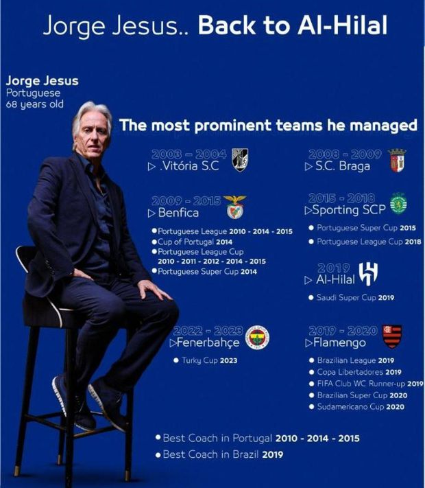 O Al Hilal, equipa que em 2023/24 será orientada por Jorge Jesus, mostrou, nas redes sociais, o currículo do treinador português, que regressa ao clube saudita e vai encontrar o compatriota Rúben Neves no plantel.