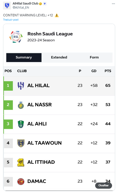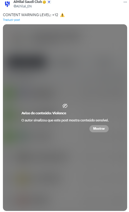 O Al Hilal partilhou a classificação nas redes sociais, mas com um «aviso de conteúdo sensível», destacando ainda o «+12».