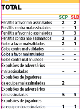 No que toca aos lances em que foram beneficiados, contam-se, também segundo as análises de Duarte Gomes, sete erros a favor das águias e oito em benefício dos leões.
