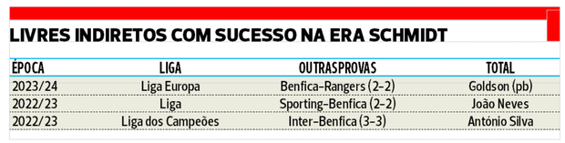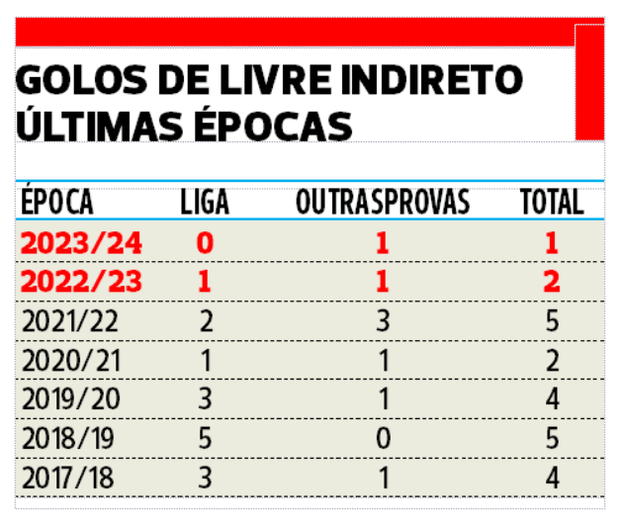 A equipa da Luz apenas marcou um golo de livre indireto (!) nas últimas duas Ligas (num total de 60 jogos, 34 de 2022/23 mais 26 desta temporada), através de João Neves, em Alvalade na penúltima jornada da época passada, e no lance que estabeleceu o 2-2 final, numa falta cobrada por Aursnes e que depois de três ou quatro carambolas chegou ao pé direito do jovem médio que fez desta forma o seu primeiro golo de águia ao peito.