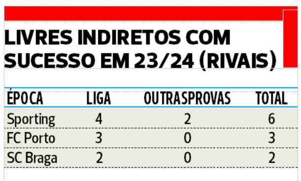 E comparando com os números dos três principais rivais desde agosto, verifica-se que todos têm melhor registo que os encarnados, com o Sporting a destacar-se com seis golos apontados de livre indireto – quatro na Liga e dois na Liga Europa, através de Paulinho (2), Coates (2), Gonçalo Inácio e Diomande –, o FC Porto tem três (Evanilson, Eustáquio e Fábio Cardoso) e o SC Braga soma dois livres indiretos com sucesso através de Simon Banza.