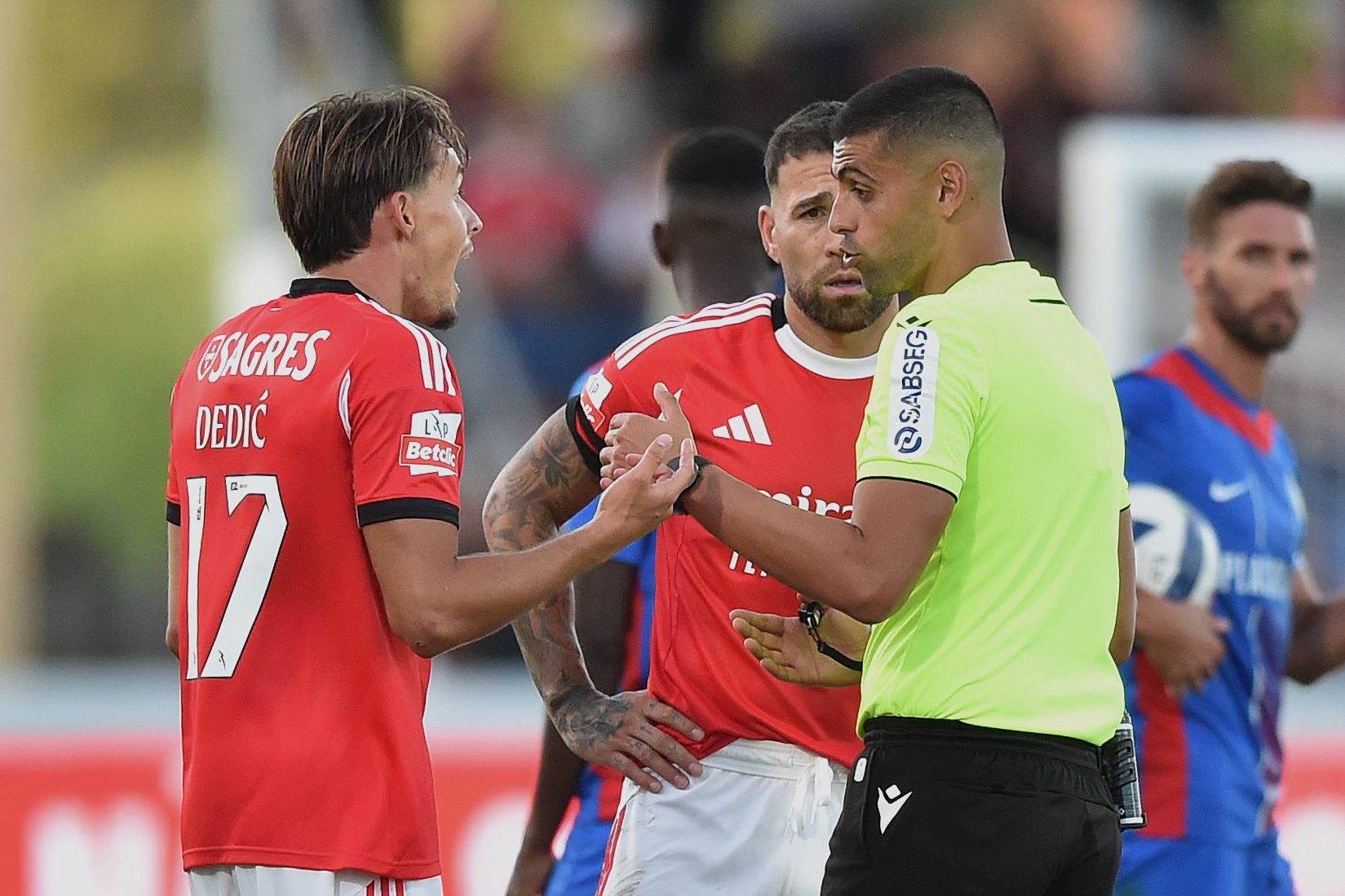5' O primeiro golo dos encarnados foi legal e sem qualquer infração à lei do fora de jogo. No momento do cabeceamento de Enzo Barrenechea, o seu colega Andreas Schjelderup que vai fazer o golo sai de posição correta. O lance ainda esteve a ser analisado pelo VAR, pois estavam dois jogadores encarnados em fora de jogo posicional, Leandro Barreiro e Franjo Ivanovic, mas ambos vem em sentido contrário e nenhum deles tem qualquer impacto ou interferência sobre os adversários, nomeadamente sobre Sergi Gomez que ainda dá um toque na bola com a ponta do seu pé direito. Ivanovic que é o que está mais perto, parou e de forma clara não tenta jogar a bola nem disputar o lance com o jogador ribatejano.