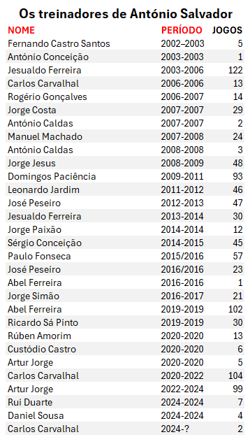 António Salvador não espera para mudar amanhã o que pode mudar hoje. Foi assim com Fernando Castro Santos, Rogério Gonçalves, Jorge Costa, José Peseiro, Jorge Simão ou Ricardo Sá Pinto, por exemplo. Paciência teve apenas com poucos treinadores. Sobretudo com Jesualdo Ferreira, Jorge Jesus, Domingos Paciência, Paulo Fonseca, Abel Ferreira e Carlos Carvalhal, claro. Com CC é um amor que já vai em dois divórcios e três casamentos. Que seja eterno enquanto dure, como diria Vinicius de Moraes...