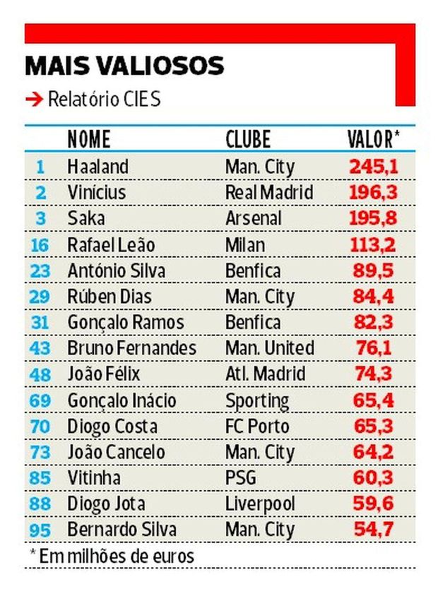 António Silva, 19 anos, é o terceiro defesa-central mais valioso do mundo, concluiu um estudo do Observatório do Futebol CIES ontem publicado. Erling Haaland, avançado do Man. City, é o jogador com o valor de mercado estimado mais elevado (€245,1 milhões), seguido de Vinícius, do Real Madrid, e Saka, do Arsenal, também avançados. Rafael Leão, que acabou de renovar com o Milan, é o primeiro português da lista, avaliado em €113,2 milhões.