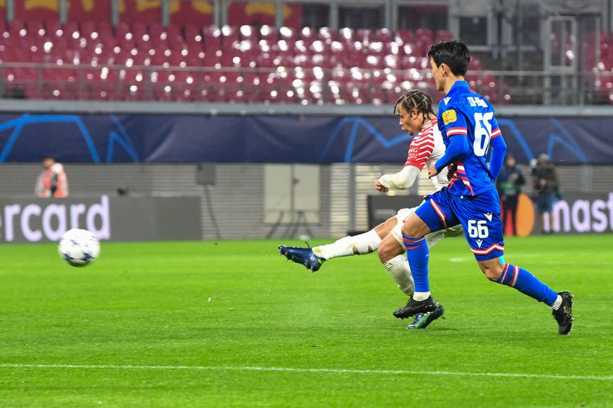 Xavi Simons recebeu a bola no meio-campo, tirou um adversário do caminho e rematou a bons 30 metros para um golaço no encontro do Leipzig diante do Estrela Vermelha, na Alemanha.