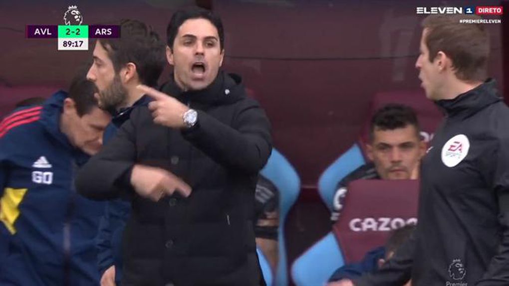Com o jogo ainda em 2-2, aos 89 minutos, o ambiente estava elétrico no Villa Park, e depois de Hooper mandar repetir um livre, Arteta imitou o gesto do árbitro de que a bola estava em movimento.