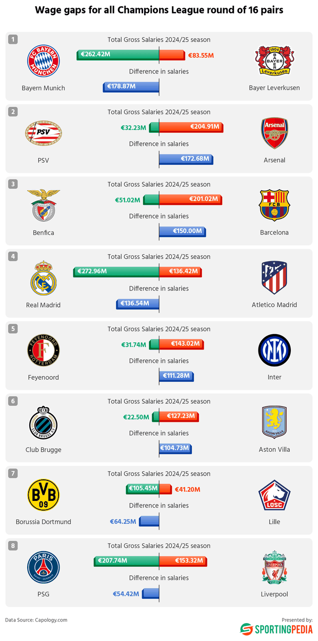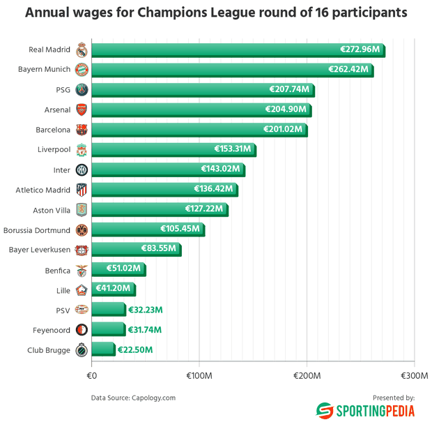 Uma análise realizada em conjunto pelo portal Sportingpedia e pela plataforma Capology demonstrou a distribuição dos mais de dois mil milhões de euros anuais que estes 16 clubes dispendem em salários. O maior gastador, sem supresas, é o Real Madrid, com uma folha salarial de 272,96 milhões de euros. Logo a seguir surgem o Bayern (€262,42 milhões) e o PSG (€207,74 milhões).