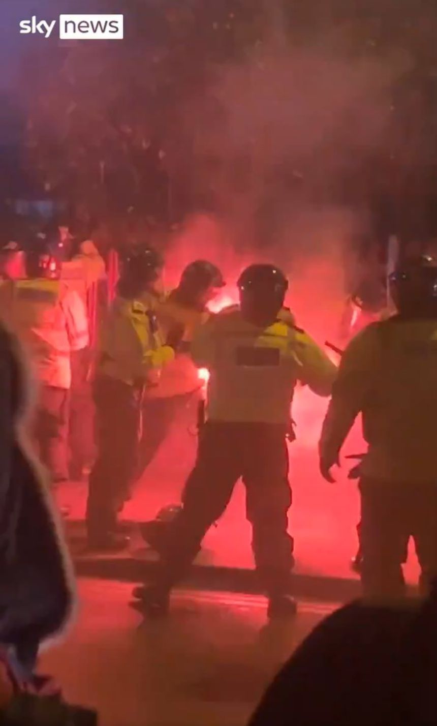 A police officer's jacket caught fire after being hit by a flare during clashes before Aston Villa's match with Legia Warsaw.