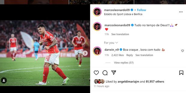 Foi saudado por vários companheiros, como Di María, David Neres ou Arthur Cabral – que não esteve neste jogo – e até Gabigol, mas salta também à vista o incentivo do ex-Benfica Darwin Núñez, hoje no Liverpool.