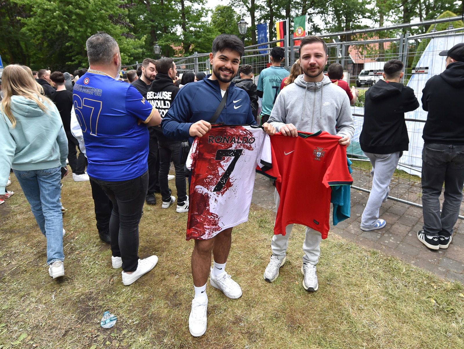 Ao final da manhã, a estrela-mor da Seleção aproximou-se das dezenas de fãs que há muito tempo esperavam encostados às grades, à procura da melhor fotografia ou de um autógrafo dos craques portugueses. Tiveram sorte estes. O capitão foi mesmo falar com eles, num momento de interação raro, tal é a segurança que rodeia a equipa.