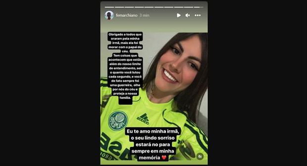 «Obrigado a todos que oraram pela minha irmã. Mas ela foi morar com o papai do céu. Tem coisas que acontecem que estão além do nosso limite do entendimento. Sei o quanto você lutou cada segundo e você de fato sempre foi uma guerreira. Olhe por nós do céu e proteja nossa família.», escreveu Felipe Marchiano, irmão de Gabriela, via Instagram.
