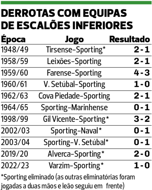 Nos últimos 15 jogos da Taça de Portugal, o Sporting perdeu apenas dois: na final de 2023/2024  (1-2 com o FC Porto de Sérgio Conceição) e no primeiro jogo de 2022/2023 (0-1 com o Varzim de Tiago Margarido). O treinador leonino era, nos dois jogos, Ruben Amorim.