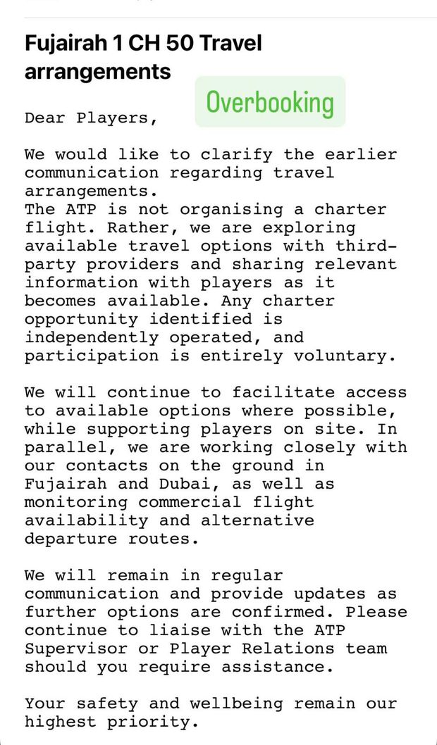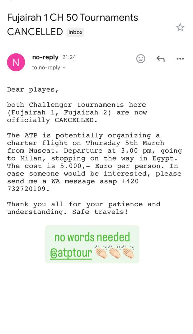 «Caros jogadores, ambos os torneios aqui foram oficialmente cancelados. A ATP poderá potencialmente organizar um voo charter na quinta-feira, 5 de março, a partir de Mascate. O voo partiria às 15h00 para Milão, com escala no Egito. O custo é de 5.000 euros por pessoa. Se alguém estiver interessado, por favor, envie-me uma mensagem.»