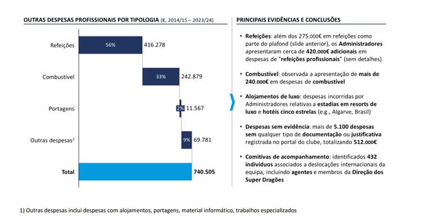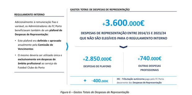 A última área de análise da auditoria forense às contas da SAD do FC Porto centrou-se na análise das Despesas de Representação incorridas pelas anteriores equipas de Administração, com a avaliação das condições de elegibilidade/conformidade e o impacto total no decurso das últimas 10 épocas desportivas (2014/15 a 2023/24). Principais destaques da análise são os seguintes: