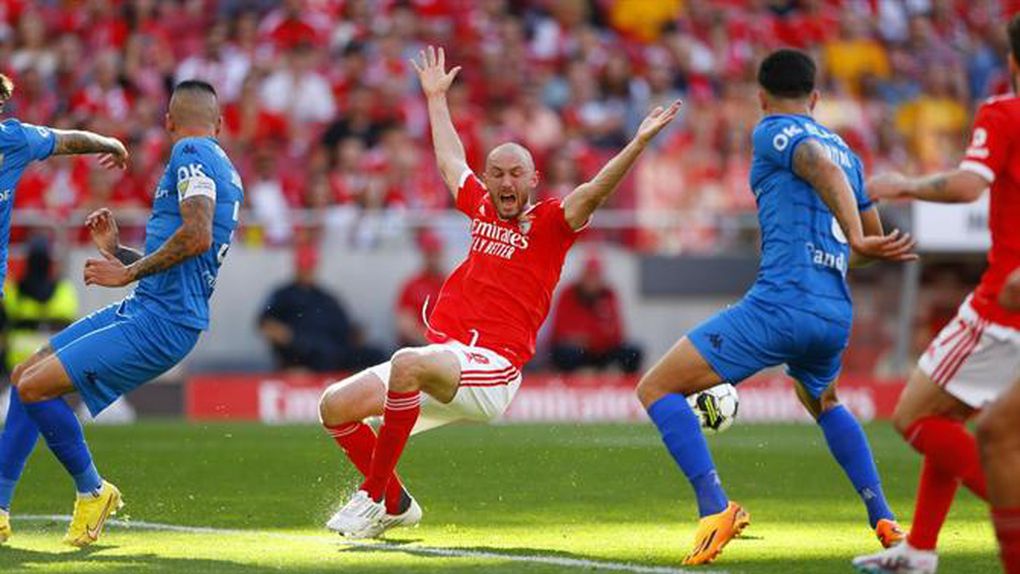 Fredrik Aursnes caiu na área, aos 21 minutos, e ficou a pedir penálti por falta de Tiago Araújo. Rui Costa não marcou nada e, após ouvir o VAR, mandou seguir o jogo.