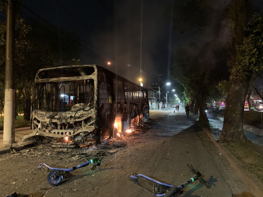 Registro dos três ônibus incendiados no canal 1, em Santos, após o rebaixamento do Peixe na Vila Belmiro.. #deolhonopeixe pic.twitter.com/UuGy2x2oHP